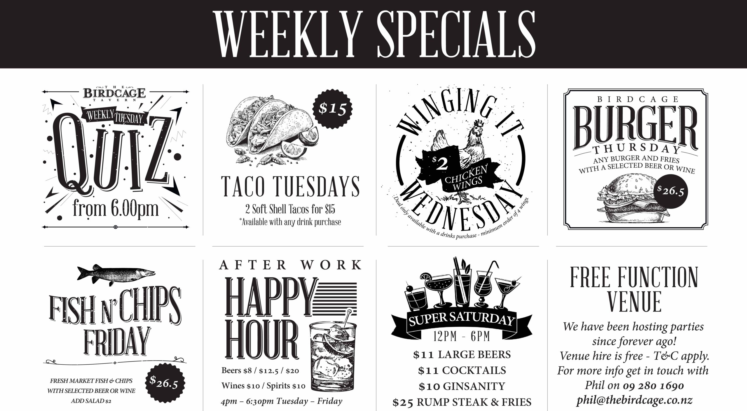 The Birdcage is a neighbourhood tavern serving comfort food at its best. Considered as one of the top gastro pubs in Auckland it prides itself on homemade style meals prepared with quality ingredients. Our menu covers all your pub favourites with a range of pizzas, pies, burgers, fish and chips, steaks and salads. We offer a special dietary requirement menu to suit most dietary needs and are happy to accommodate as best we can.